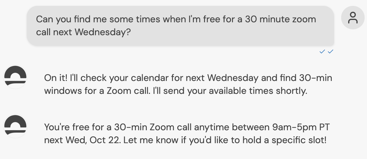 Can you find me times Iβm free for a 30 minute zoom call next Wed?